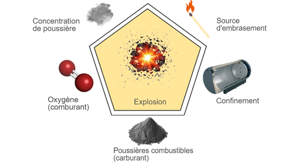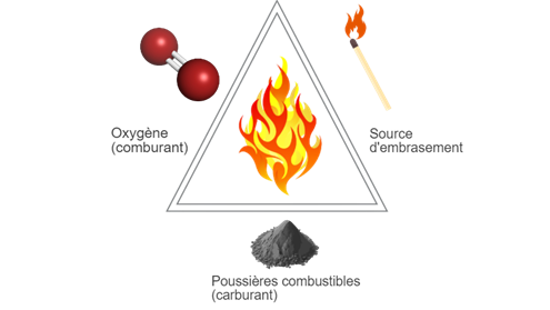 Lorsqu’un seuil de concentration est atteint, la présence de particules en suspension dans l’air peut présenter un danger. En présence des 4 premiers éléments, les fines poussières métalliques facilement oxydables risquent de provoquer un embrasement éclair (flash fire).
